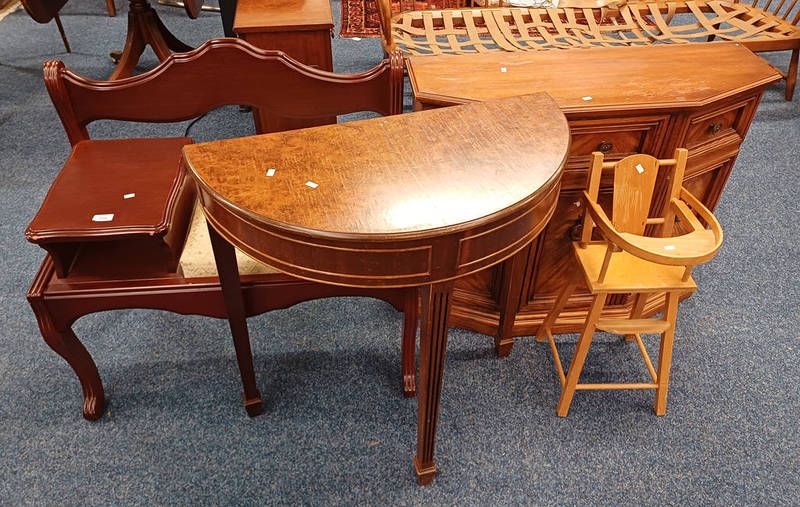 Walnut demi-lune table, hardwood phone seat, etc.