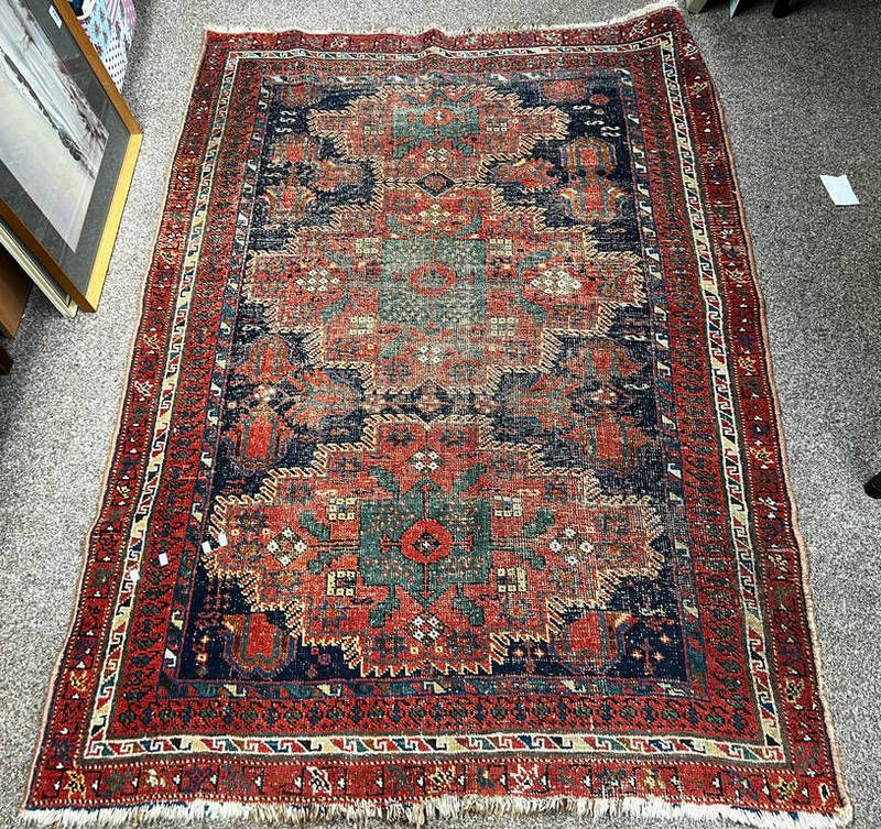 Middle eastern rug with blue and red central medalion pattern & 1 other rug -...