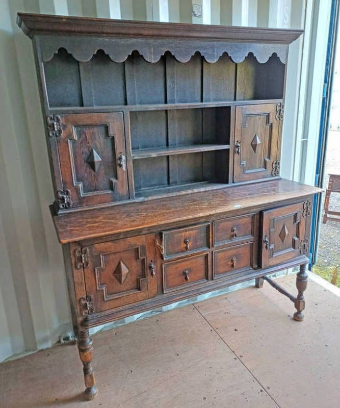 Arts & crafts oak welsh dresser with shelf back with 2 panels doors over base with 2 centrally set short drawers over single long drawer flanked by 2 panel doors. 152 cm wide