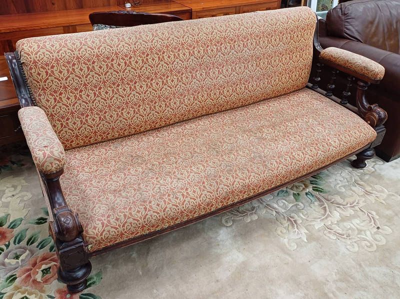 19th century mahogany framed chaise longue with decorative carving on reeded supports