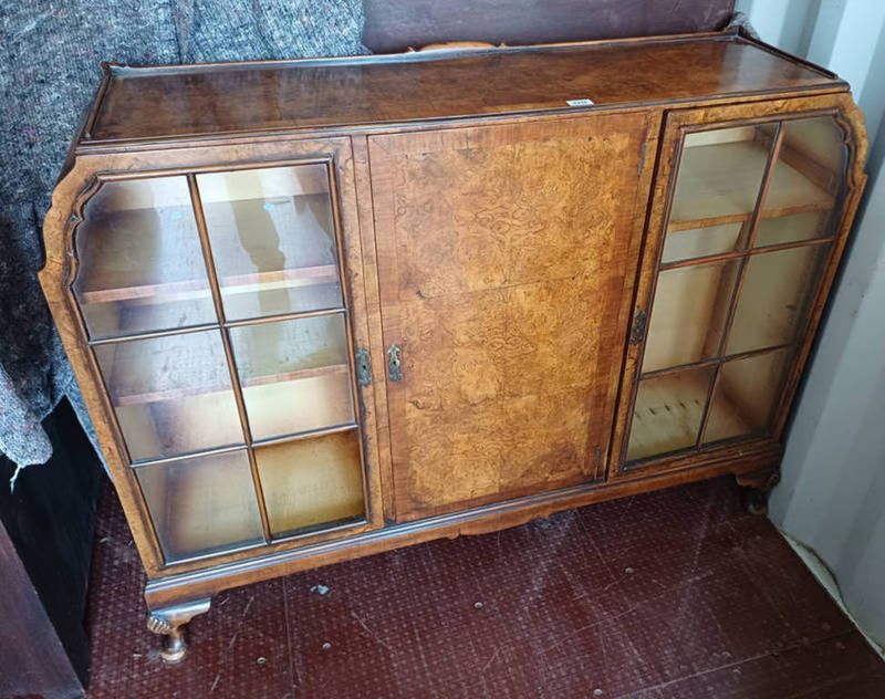 20th century walnut cabinet with centrally set panel door flanked by 2 glazed panel doors on short queen anne supports - 108 cm tall x 137 cm wide