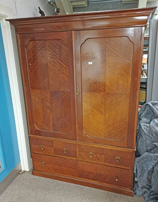 20th century mahogany wardrobe with 2 panel doors over base of 2 short over single long drawer - 210cm tall x 152cm wide x 57cm deep