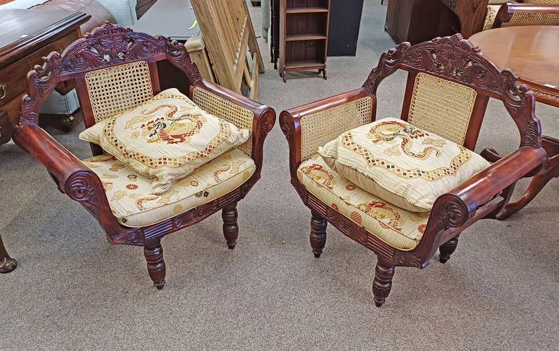 Pair of eastern hardwood framed roll armchairs with carved decoration and bergere panel backs & seats