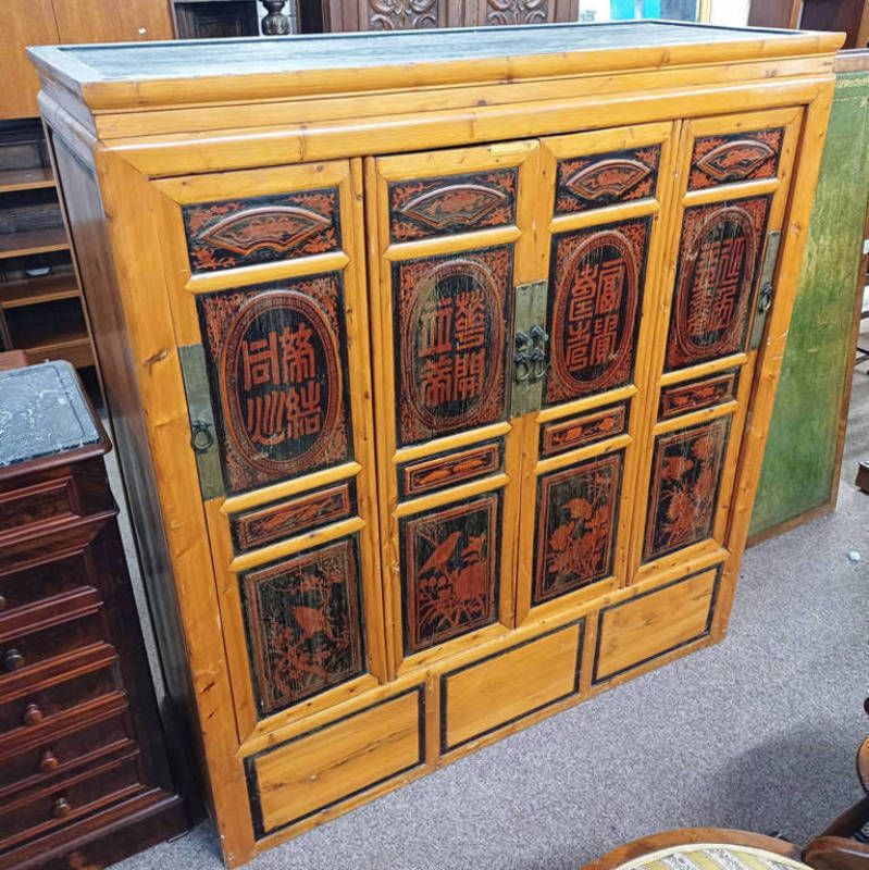 Eastern pine cabinet with 4 panel doors with red & black lacquer oriental decoration opening to 3 drawer fitted interior. 145 cm tall x 132 cm wide