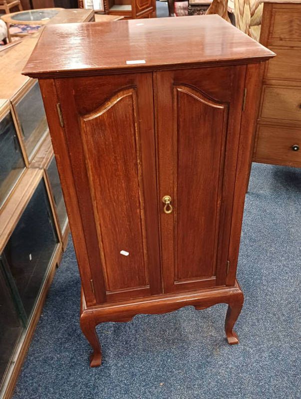 20th century mahogany music cupboard with 2 panel doors on shaped supports 102 x 103 cm