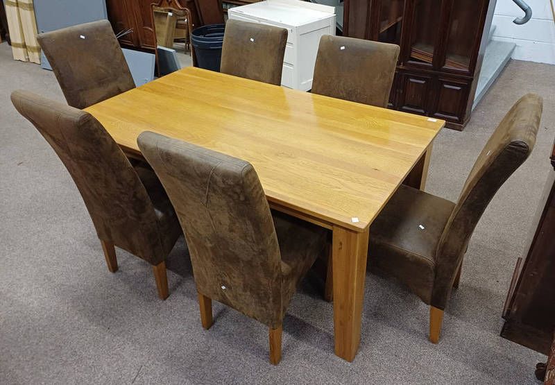 Oak rectangular dining table & set of 6 brown suede dining chairs - table 160 cm long