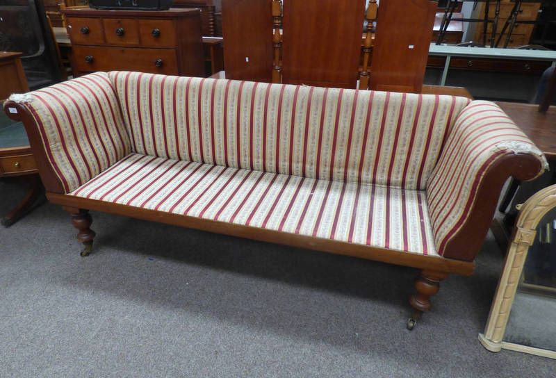 19th century mahogany roll arm settee on turned supports