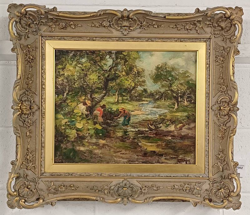 William stuart macgeorge children playing by river signed gilt framed oil on canvas 40cm x 50cm