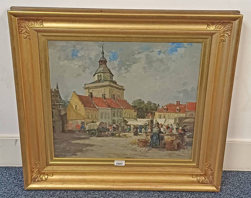 George davidson market street scene signed gilt framed oil on board 45cm x 49cm