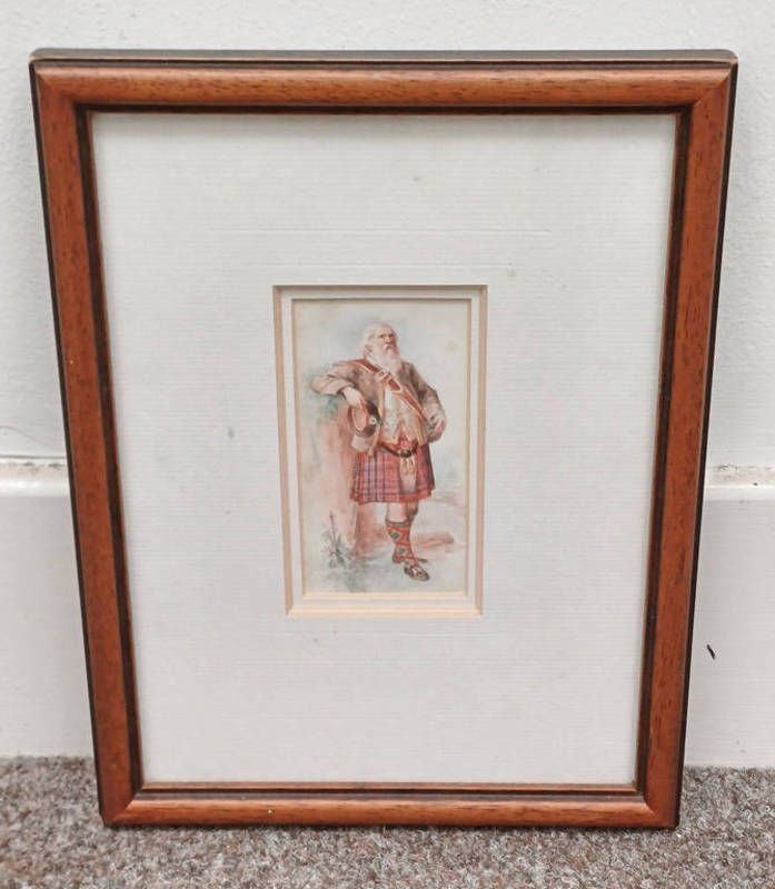 Framed watercolour of a scottish highland chieftain, unsigned, bears mcewan gallery label to reverse, 12 x 16 cm