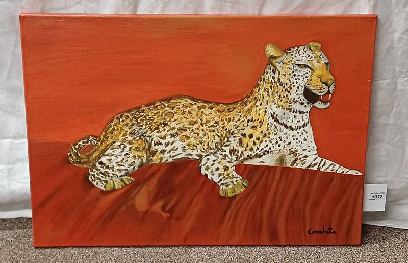 C jiminez, the leopard signed to reverse and front unframed oil on canvas 50cm x 70cm