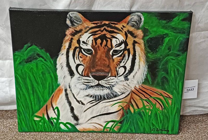 C jiminez, el tigre miron signed, label to reverse unframed oil on canvas 40cm x 50cm
