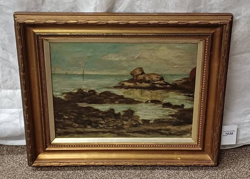 Gilt framed oil on canvas of a coastal scene, signed indistinctly to reverse, 29cm x 40cm