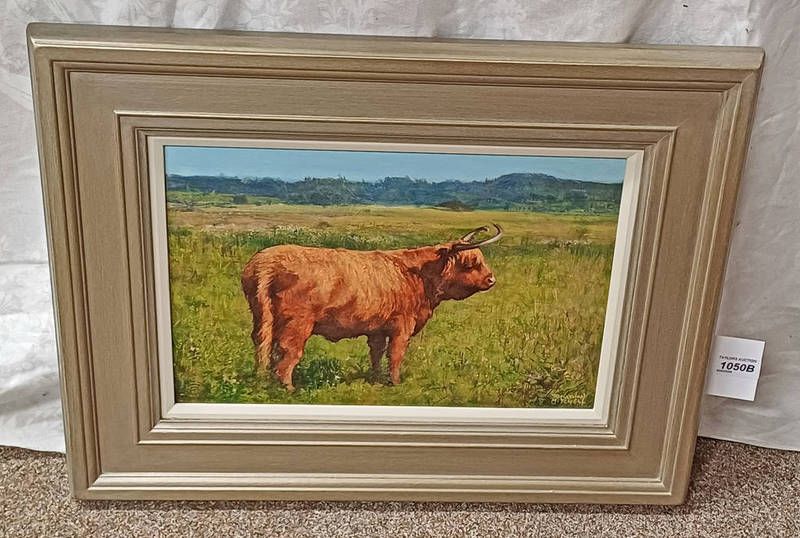 Johnathan a.s. mitchell ''a highlander at kinnardy'' signed, label to reverse framed oil on board 26cm x 39cm