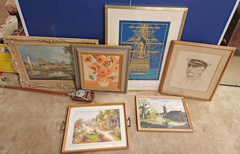 Framed pencil sketch of an admiral,signed in pencil douglas white, and various other pictures. largest; 55cm x 38cm