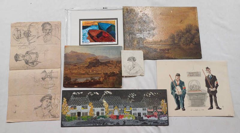 Selection of sketches on paper, painting of a village on slate, etc
