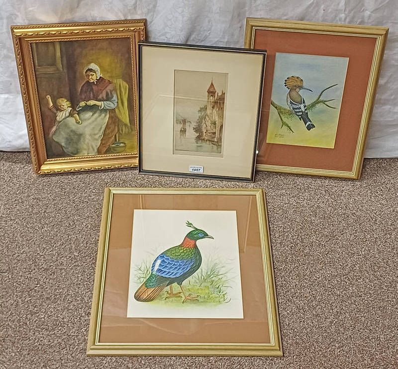 Mj watson, gilt framed oil on board titled ''grandmas help'', 2 watercolours of birds, etc