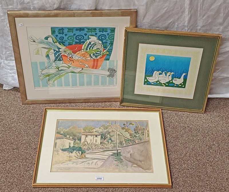 Vs roux-champion, spanish street scene, signed, framed watercolour on paper, and 2 other prints
