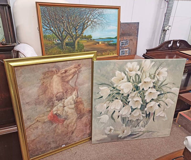 Large print of a roman figure with horse, signed parrish, and 2 others, largest 115cm x 83cm