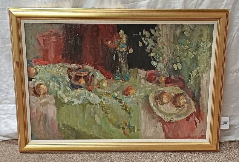 Muriel marskell ''still life with chinese figure'' signed, label to reverse gilt framed oil on canvas 60cm x 90cm