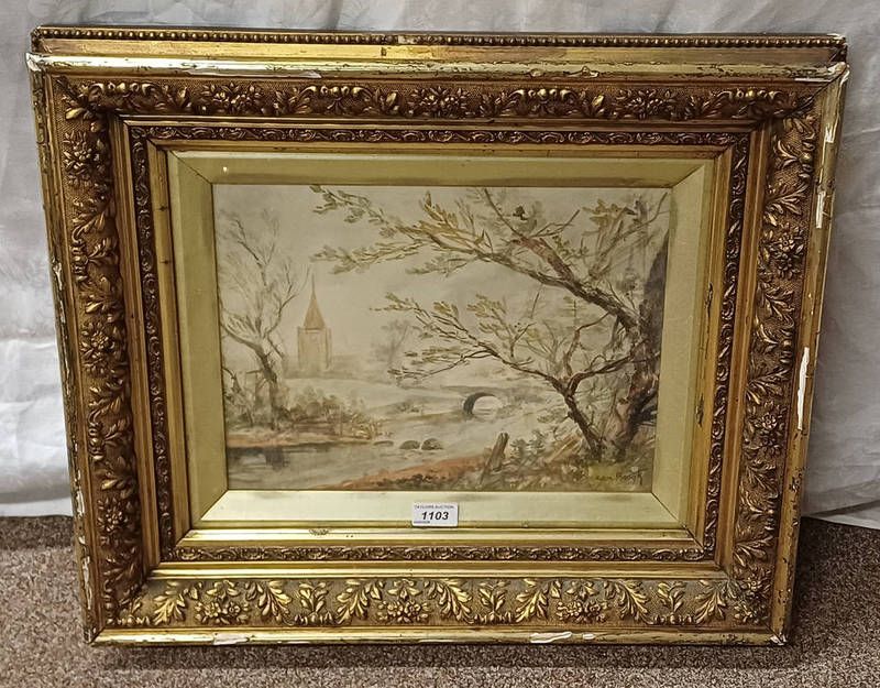 Gilt framed watercolour of a rural scene, bears signature sam bough, scottish gallery - edinburgh label to reverse, 26cm x 35cm