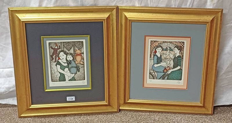 Anne barnard, 2 framed colour etchings, mother and child and two's company, both signed in pencil, 22cm x 18cm each