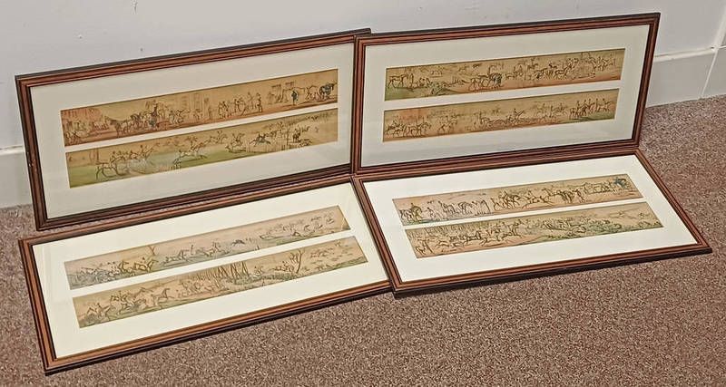 Set of 4 colour engravings of fox hunting scenes, 17cm x 55 cm each