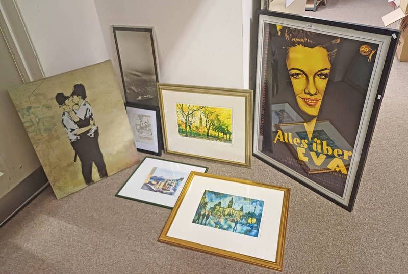 Framed german movie poster for ''all about eve'', banksy print on canvas - kissing coppers, etc, largest 92cm x 65cm