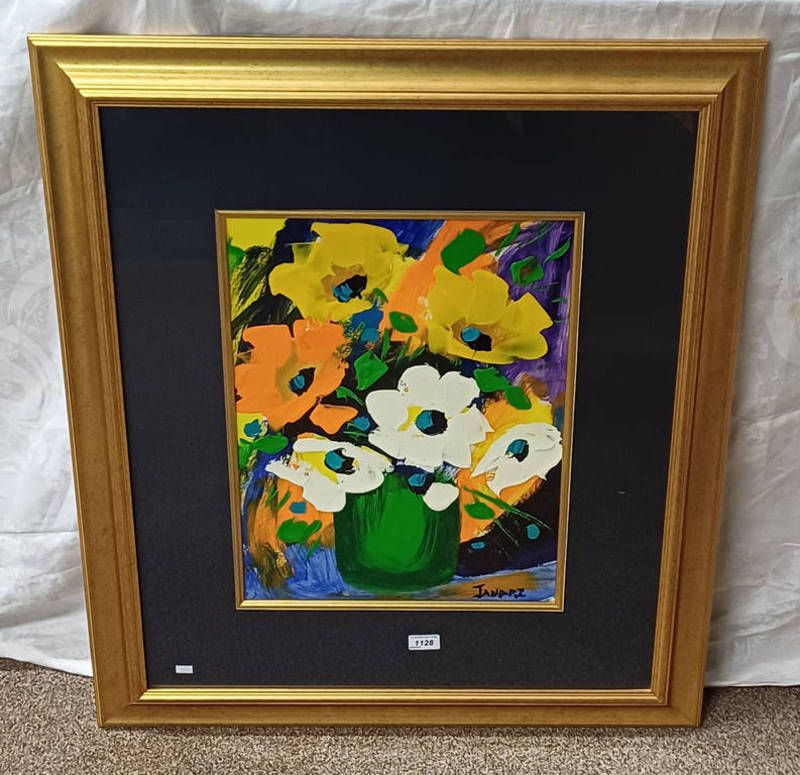 Gilt framed acrylic of still life of flowers, signed janari, 48cm x 37cm