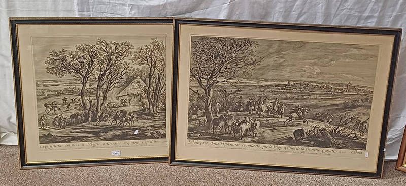 2 framed published engravings; ''expugnata in prima regis advensus sequanos expeditione'' after a painting by jan van huctenburg, and one other after f. vander meuten, largest 50cm x 79cm