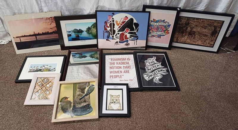 Various modern prints, shell collage, etc