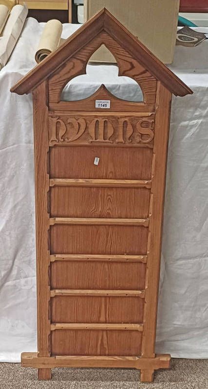 Carved wooden church hymns wall rack, 112cm long