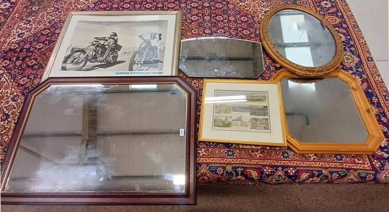Gilt framed mirror and other mirrors, motorcycle related poster, etc