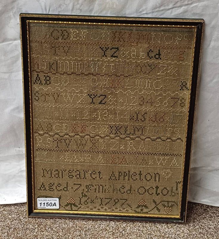 18th century needlework sampler, reads ''margaret appleton, aged 7, finished october 16th 1797'' - 33cm x 25cm