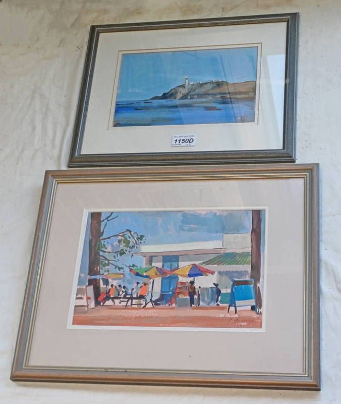 Penelope anstice, 2 framed gouache's, ''bus stop at cambodia'', and ''lighthouse at tresco'', both signed