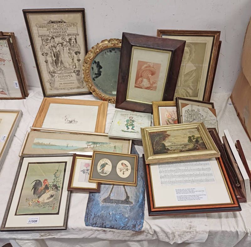 Selection of miniature pictures, gilt framed mirror, abstract painting on slate, etc