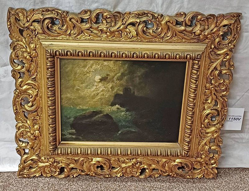 Aros castle - mull under moonlight, signed indistinctly bottom right, gilt framed oil on board, 22cm x 29cm