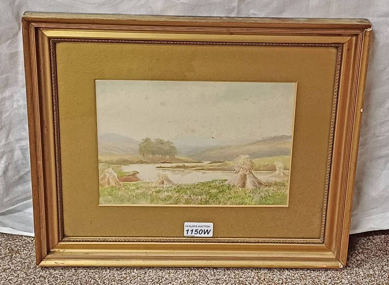 Gilt framed watercolour of a river scene with hay stacks, monogrammed g.m.d. 1911, 17cm x 25cm