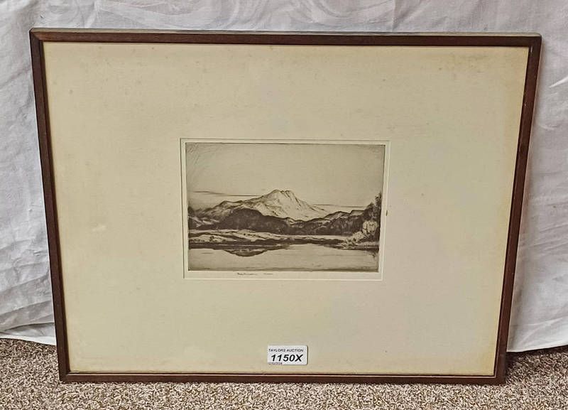 Framed etching of a mountain scene, signed in pencil mathieson muir, 14cm x 18cm