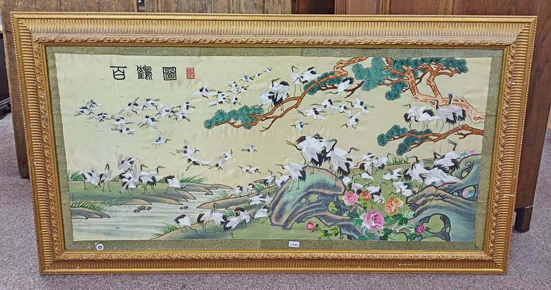 Gilt framed oriental needlework of cranes, signed with character marks, 74 cm x 151 cm