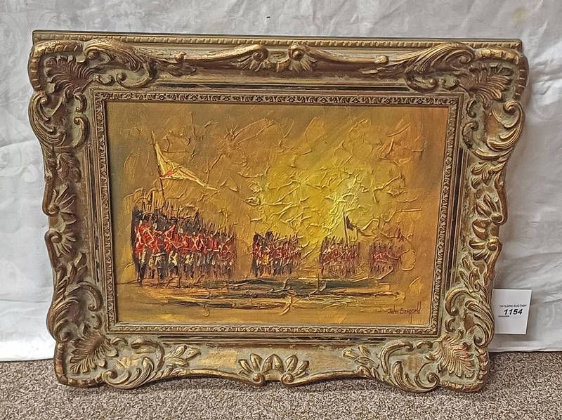 John bampfield troops in formation signed gilt framed acrylic on canvas 29cm x 39cm