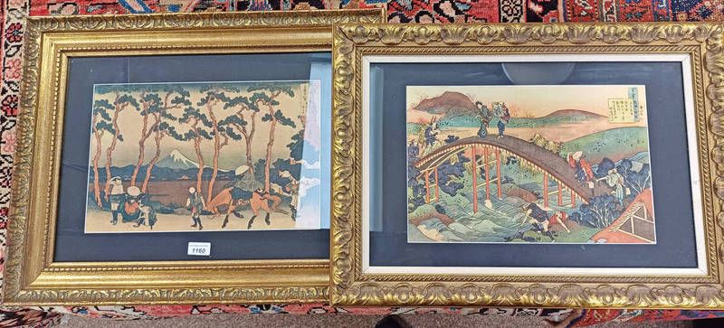 2 gilt framed oriental prints of figures on horseback & a bridge crossing, largest 27 x 41 cm