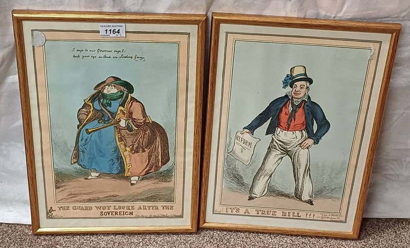 2 framed political caricature published prints by thomas mclean; ''the guard wot looks after the sovereign'' and '' its a true bill!!!'', 34cm x 23cm each