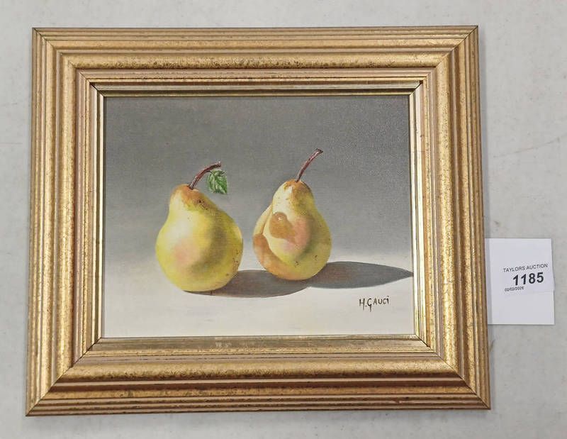 Hilary gauci pair of pears gilt framed oil on board signed, label to reverse 17cm x 22cm
