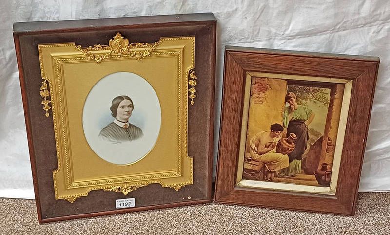 Framed portrait of a 19th century lady, signed indistinctly, with a gilt border, and a crystoleum of a female and a potter