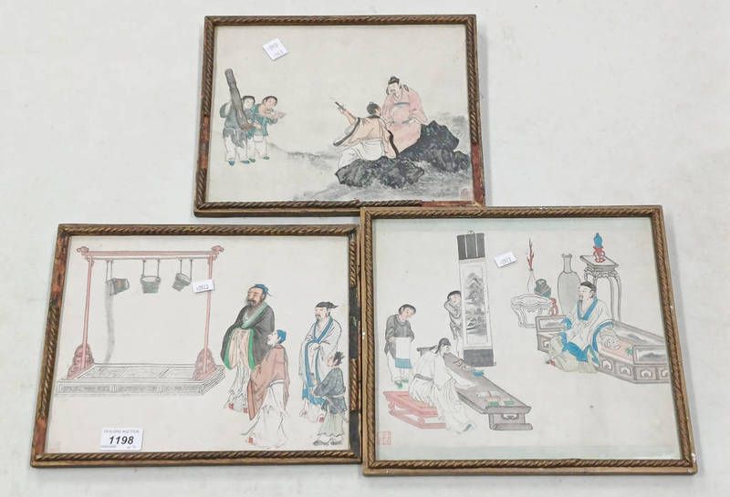 3 oriental gilt framed watercolours of various figures in interior scenes, one with character mark