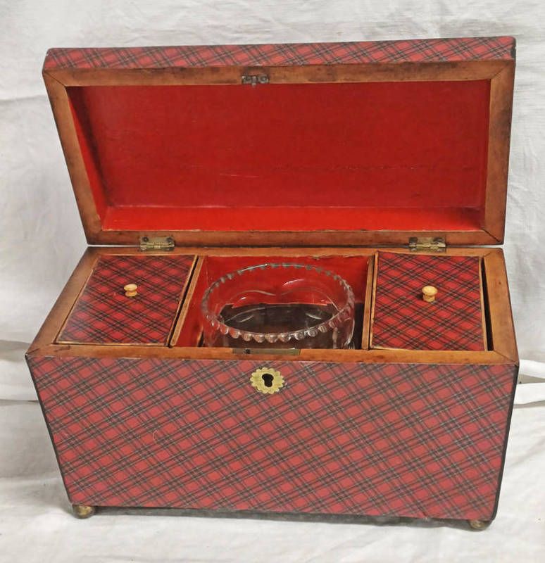 19th century tartan ware tea caddy, sectional interior with lids and glass bowl, body with brass feet and pommel, 31.5cm across