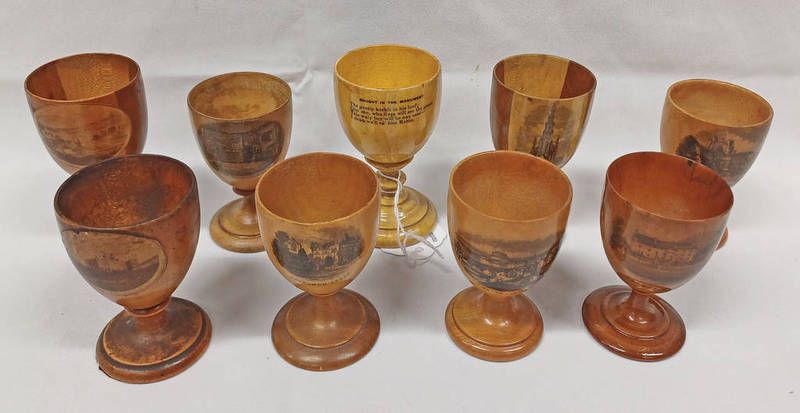 Nine 19th century mauchline ware egg cups, scenes include dryburgh abbey, peebles from the north, north berwick, tantallon castle, etc, tallest 8.2cm
