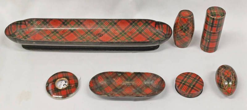 19th century tartan ware examples to include a stuart tartan dish 28cm long, princess louise oval dish 11.4cm long, sinclair brooch 5cm across, mcpherson egg shaped thimble holder 5.5cm long, etc -7-