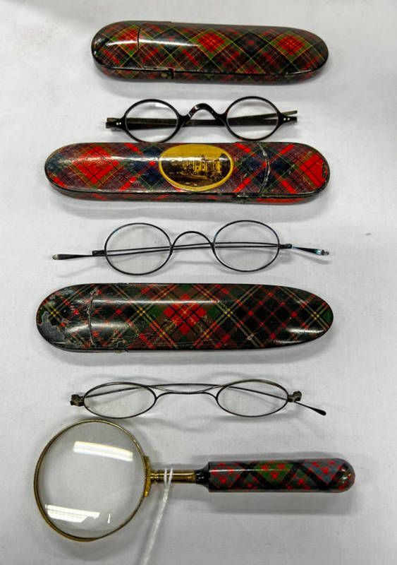 Three 19th century tartan ware glasses cases, case with melrose abbey scene marked caledonia with glasses, two other cases marked caledonia and albert, both with glasses along with a tartan ware magnifying glass marked mcdonald longest 15.5cm -4-